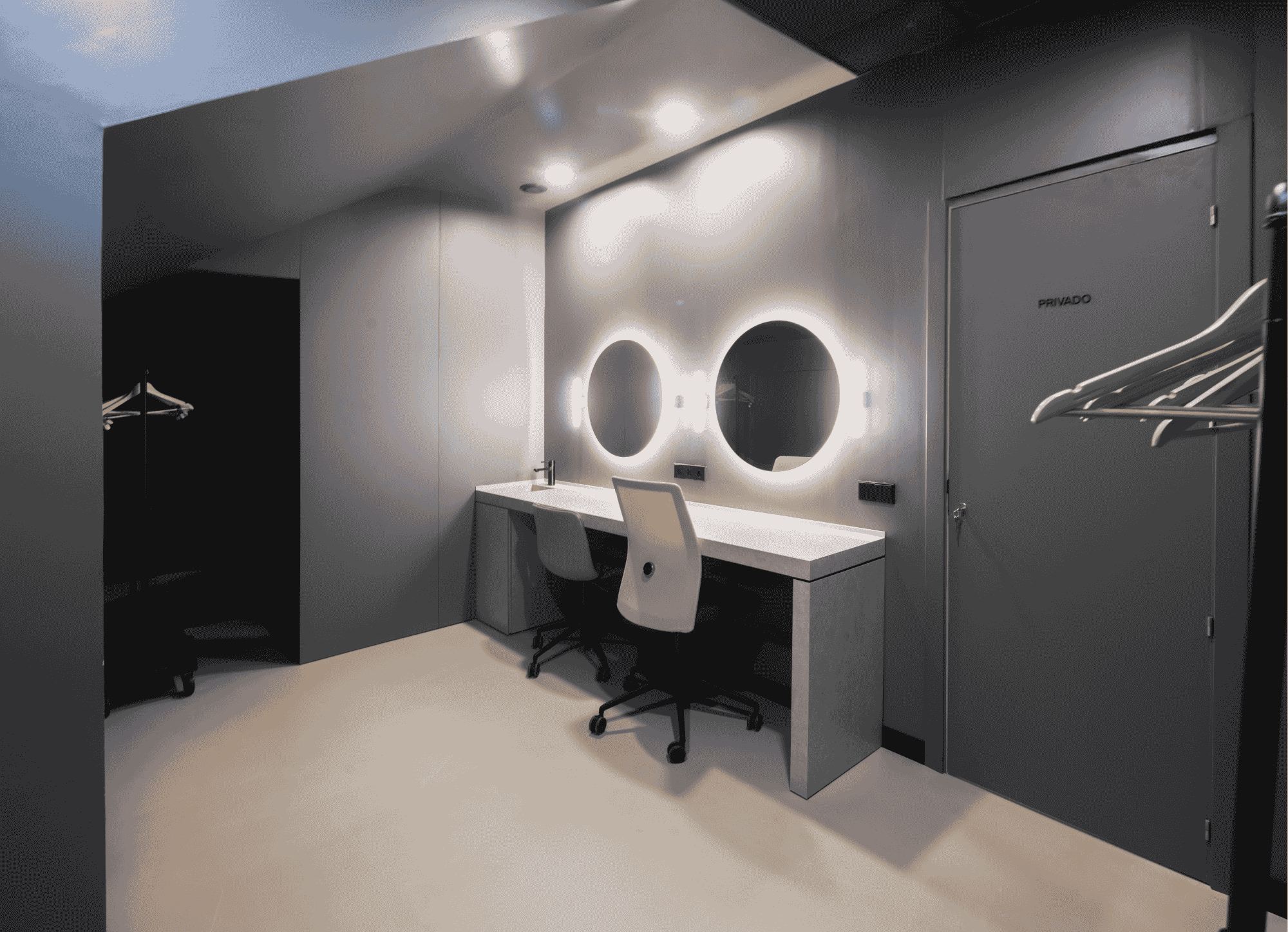 Nuestro camerino está equipado con todas las comodidades esenciales: set de maquillaje, cocina office...